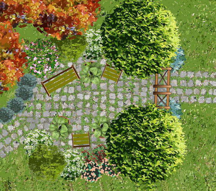 Cette partie de jardin est souvent un lieu de repos ; évitez les plantes mellifères qui attireraient trop d’insectes. C’est l’endroit rêvé pour sortir vos pots de plantes exotiques de la véranda.