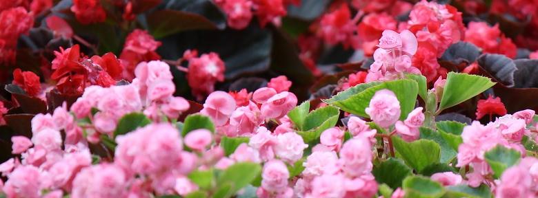 De bégonias hybrides FI qui offre une grande régularité de taille et de floraison. Les couleurs employées sont le rouge, le rose et le blanc. Elles vous permettent de confectionner des motifs harmonieux.