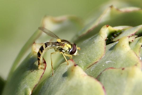 Ici, sur une tête d’artichaut, cette femelle syrphe « porte-plume » a repéré la colonie de pucerons qui commence à s’installer. Elle y dépose ses œufs. Ses futures larves auront de quoi se nourrir et vous débarrasseront en même temps de ces indésirables.