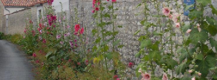 Dans les villages et les hameaux, les aménagements le long des trottoirs de maison seront d’autant plus facilement tolérés qu’ils font partie du décor et des coutumes. (On en trouve de beaux exemples en Charente maritime ou les somptueuses roses trémières ont envahi les trottoirs des villages comme ici aux alentours de Surgères).