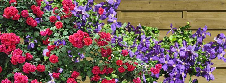 Un mélange toujours réussi, c’est les clématites mélangées avec des rosiers grimpants.