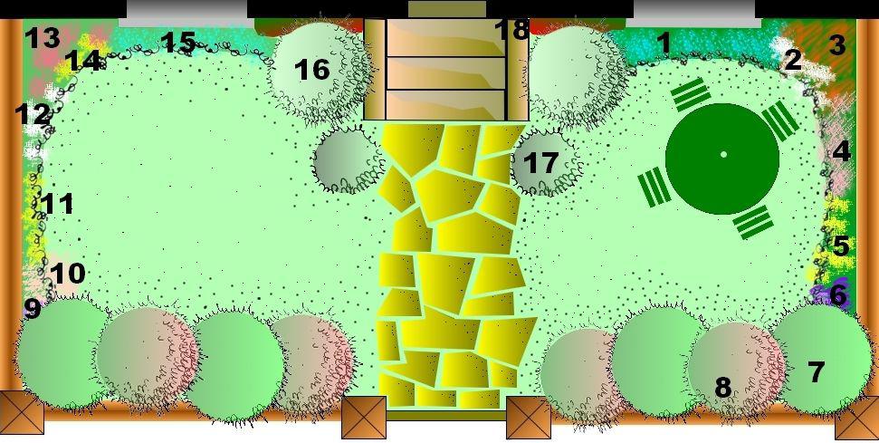 Ces espaces sont soulignés par des massifs où dominent plantes vivaces : 1 nepeta mussini, 2 phlox paniculata, 3 fuchsia ricartoni, 4 tulbaghia violacea, 5 rudbeckia cherokee, 6 géranium himalayense plenum, 9 campanule lactiflora loddon anna, 10 géranium cinereum, 11 crocosmia walberton yellow, 12 agapanthe windsor grey, 13 alstroemeria inca exotica, 14 coréopsis, 15 nepeta mussini.