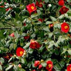 C’est un remarquable petit camélia au feuillage brillant vert sombre très dense avec un remarquable port pyramidal. De novembre jusqu’à janvier apparaissent de petites fleurs rouge brillant, contrastées par étamines jaunes. Ce camélia est idéal pour la culture en poterie sur une pierre tombale, mais demandera des visites régulières au cimetière, car il ne supporte pas la sécheresse.
