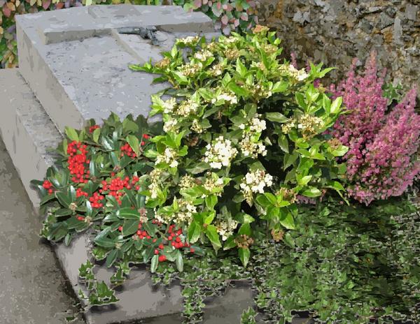 Il orne à merveille les tombes à la fois par son feuillage persistant d’un beau vert ainsi que pour ses fleurs blanches. Ces fruits rouges qui perdurent l’hiver en font une plante incontournable pour les compositions à la Toussaint. Il se cultive facilement en pot dans un substrat acide.