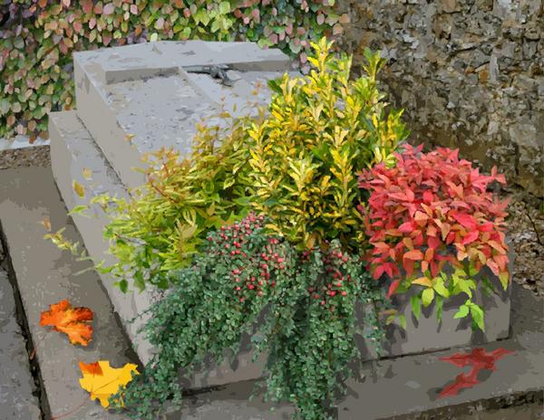 Cet arbuste nain très décoratif notamment pour son feuillage qui à la Toussaint prend de superbes teintes rouge vif et orange. Il se cultive parfaitement en pot. Préférez son utilisation si la tombe se trouve dans une partie ensoleillée du cimetière. Il peut rester de longues années dans un grand pot, il suffira de lui apporter lors des arrosages un peu d’engrais complet soluble bio.