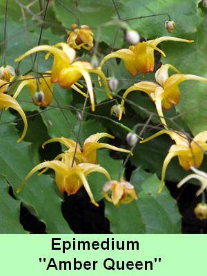 Epimedium «Amber Queen » : Floraison de mai à juillet orangée. Le feuillage de cette plante des elfes est intéressant, il est persistant, vert clair devenant foncé. Hauteur de 20 cm. Il pousse assez lentement.