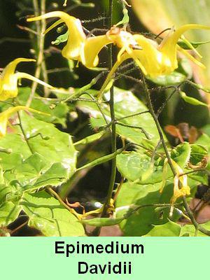 Epimedium Davidii : feuilles à bords ondulés rouges devenant vert clair. Les fleurs sont jaune franc. Sa hauteur est de 40 cm.