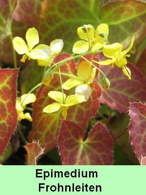 Epimedium « Frohnleiten » : Beau feuillage persistant vert brunissant. Belle floraison jaune d’or que portent des tiges de 30 cm de hauteur.