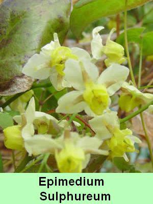 Epimedium « Sulphureum » : belle et abondante floraison jaune au cours du printemps. Feuillage couleur cuivrée devenant pourpre en automne. Plante de 25 à 30 cm.