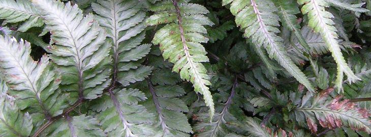 Fougère "arc en ciel" : Les couleurs typiques de cette fougère (gris argenté avec des nervures pourpres) se détacheront sur des espèces naines vertes. Le feuillage disparait en hiver.