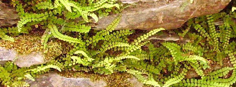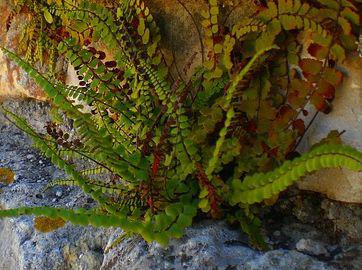 L’asplénium ruta-muraria est une superbe petite fougère avec des frondes rigides, à bords ondulés qui colonisera les fissures des rochers de votre rocaille.