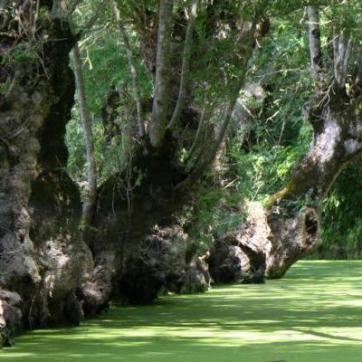 Les frênes cultivés au bord des canaux du marais poitevin sont taillés en « têtards » comme ici à Maillezais. Ils sont appelés par les Maraichins « cosses ».