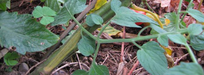 Pour la tomate, on remarque une décoloration de la tige commençant par un léger jaunissement longitudinal sur une portion de celle-ci et évoluant en une bande jaune plus marquée, puis en une nécrose beige à marron clair.