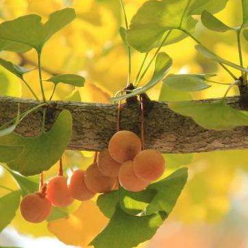 Les ovules, jaunes, gros comme des cerises, tombent en novembre-décembre et leur pulpe a une odeur désagréable. Les ginkgos ne produisent pas de fruits au sens botanique (drupe avec des graines), mais des ovules qui si elles sont fécondées germent immédiatement en tombant au sol.