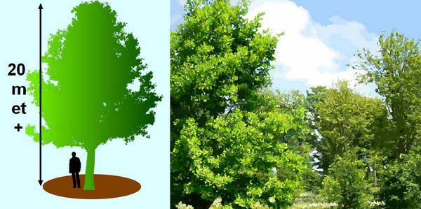 Ce bel arbre peut atteindre 20 m, voire plus en bonnes conditions de culture. Port érigé chez les sujets mâles, plus étalé chez les sujets femelles qui sont également un peu moins vigoureux.