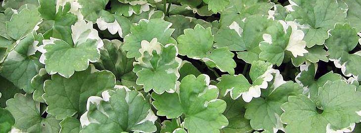 Les petites feuilles rondes vertes, panachées de blanc du Glechoma hederacea « variegata » retombent en longues tiges grêles avec de petites fleurs violacées. Il trouvera sa place dans des suspensions avec des surfinias par exemple.