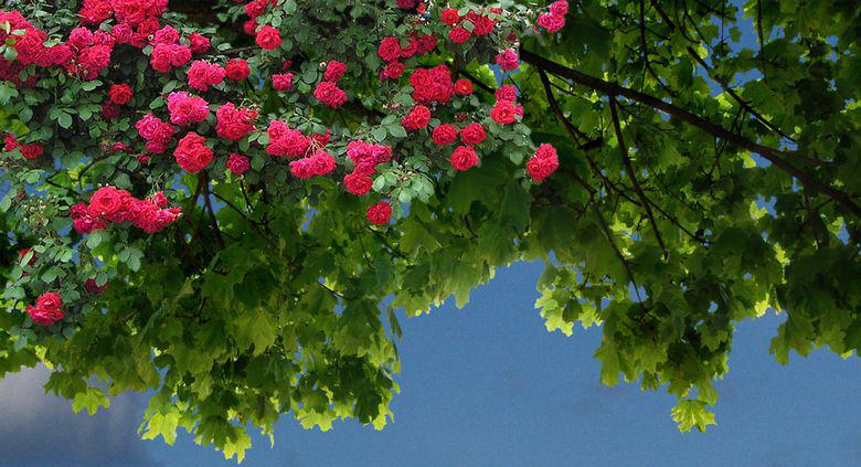 Attention si c’est un arbre mort il doit être encore solide et bien ancré au sol, car les rosiers liane ont un grand développement. Sur des arbres vivants bien sûr, mais préférez des arbres adultes et hauts, avec de solides branches. La végétation doit être aérée et générer une ombre légère.