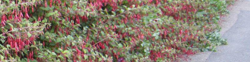 Haie basse fleurie de fuchsia de Magellan pour séparer un potager du reste du jardin: