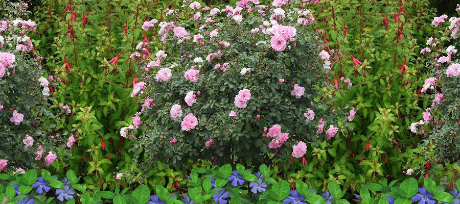 Mélangez le fuchsia de Magellan alba avec le fuchsia de Magellan ricartoni. Pour faire ressortir cette haie fleurie, mettez au pied des fuchsias des pervenches à petites feuilles.