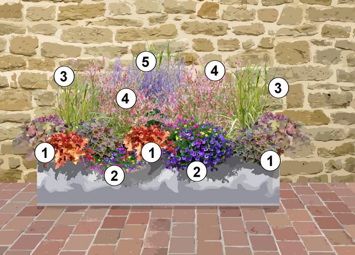 Les plantes que je vous suggère en plus des heuchères (1), des surfinia million bells(2) pour l’été et des viola cornutta pour l’hiver et le printemps, des graminées panachées (3), des gauras (4), une sauge d’Afghanistan(5).
