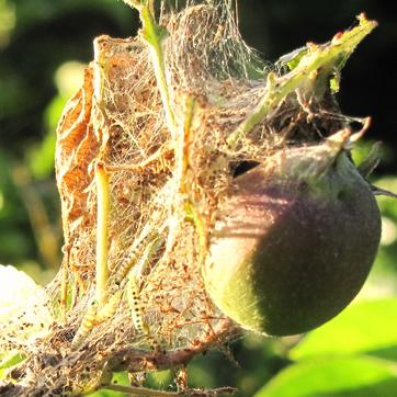 Des chenilles groupées dans un large cocon soyeux dévorent les feuilles et l’extrémité des jeunes rameaux.