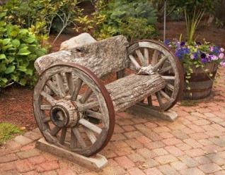 Ici un joli banc, fait avec des roues de petite charrette et de vieilles planches brutes, orne cette terrasse. Pour compléter ce décor, un demi-tonneau rempli de fleurs.