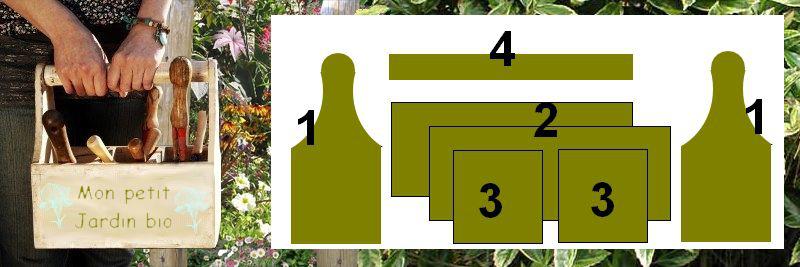 Facile à faire cette caisse à outils de jardin déco vintage. Découpez dans une planche de 1 cm épaisseur minimum, les différents éléments comme sur le plan (la hauteur total 40 cm). La poignée est un tronçon de petit piquet en châtaigner ( un morceau d'ancien manche à outils fera aussi l'affaire).