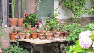 Un morceau d'escalier meunier posé contre un mur reçoit des potées de fleurs, et de vieux objets.