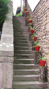 Même avec du vieux on peut faire une déco tendance comme avec ces pots peints en rouge posé sur des morceaux de poutres plantés de chlorophytum qui donne bel allure à cette escalier en pierre.