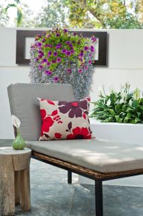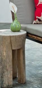 Même dans un jardin contemporain, la récup, comme ici ce petit guéridon fait dans un tronçon de tronc d'arbre de bois flotté, donne un petit côté romantique.