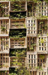 Superbe idée de déco éphémère avec cet empilement de cageots sur une haie naturelle.