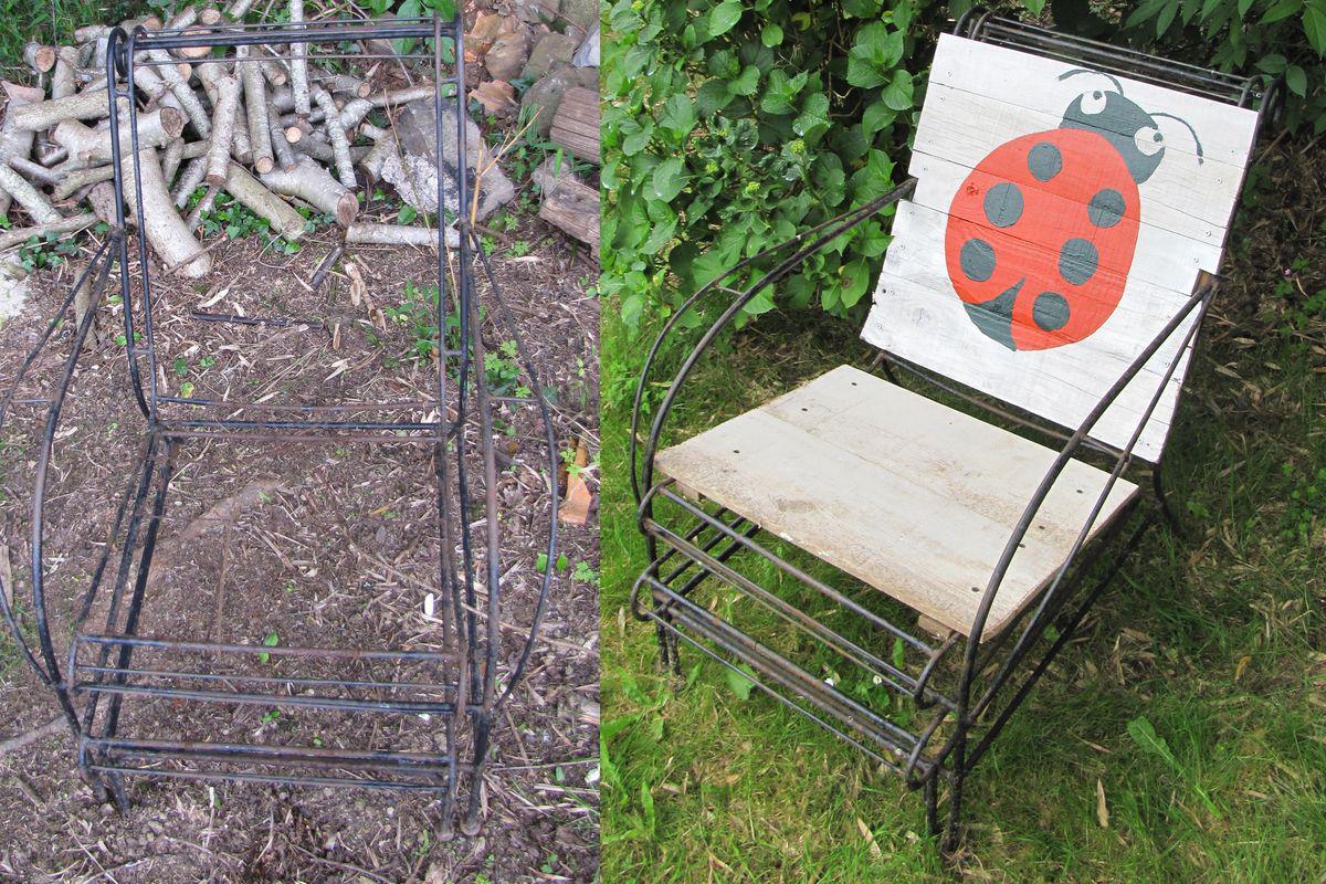 Avec cette ancienne armature, quelques planches de palette, quelques vis, des fonds de peinture et deux heures plus tard, voilà un fauteuil qui durera. Avec peint sur le dossier une coccinelle, emblème des jardins bio.