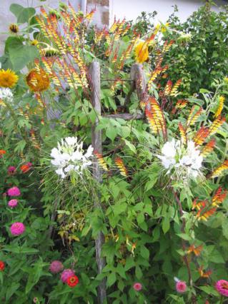 Ici la vieille échelle donne du volume et du relief à ce massif de plantes annuelles. Une mina lobata (« plume d’indien ») couvre rapidement les deux pans de l'échelle.