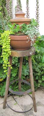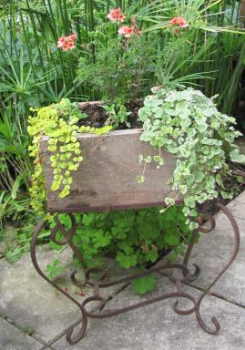 Ce pied de table, autrefois ornait un salon, recyclé, et avec quatre morceaux de planches de bois brut, le voilà transformé en jardinière.