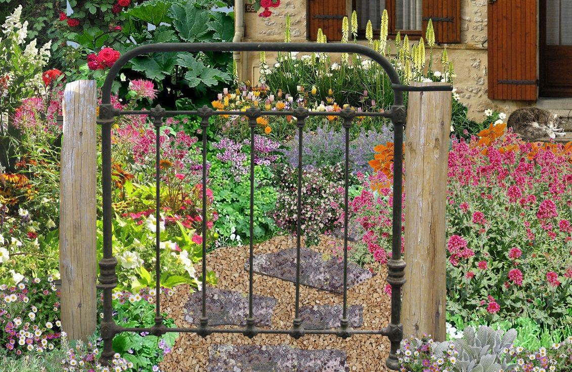 Faciles à dénicher dans les brocantes, les têtes d'anciens lits métalliques font de superbes petits portillons de jardin. Poncez-le en portant un masque si il est peint. Si il est rouillée faites simplement tomber les éclats de rouille et passez-le à l'aide d'un pinceau au « rustol ». le portillon est fixé avec des étrillers pour tube.