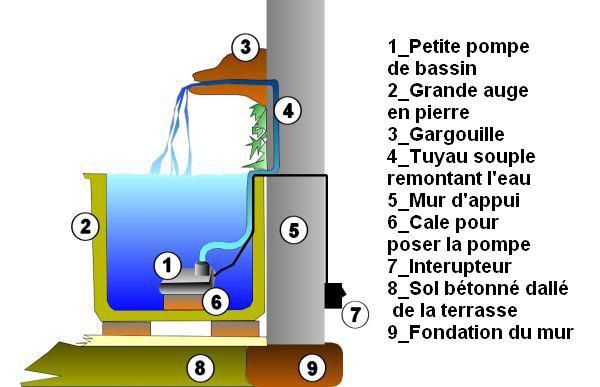 L’eau est remontée à la gargouille par une simple petite pompe de bassin.