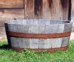 le choix du tonneau est important, préférez aux tonneaux vendus en jardineries (souvent une pâle imitation), un véritable demi-tonneau glané dans une brocante. Il demandera peut-être un peu de travail, mais l’ensemble sera plus joli. Regardez l’état des douves du tonneau, et brossez-les. Vérifiez que le cerclage est en bon état. Sinon fixez le bien à l’aide de clous pour l’empêcher de glisser. Remplissez le tonneau, il faut répéter l’opération plusieurs fois jusqu’à ce que le bois gonfle. En cas de fuite, bouchez avec de l’étoupe. Pour éviter que le fond de votre demi-tonneau pourrisse, posez-le sur des cales. Pour planter votre demi-tonneau, procédez comme pour le bac.