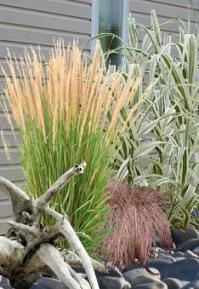 Pour cacher le bas du mobil home un massif de graminées est installé avec des galets.