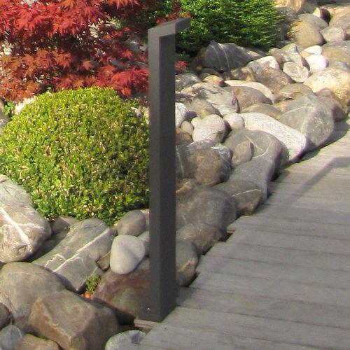 Des bornes d’éclairage de style contemporain, ponctuent l’allée le long des galets.