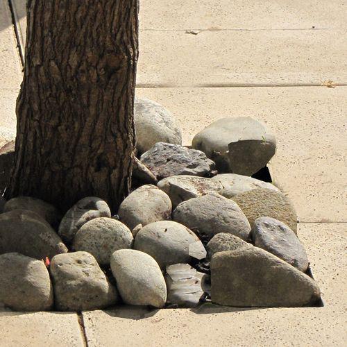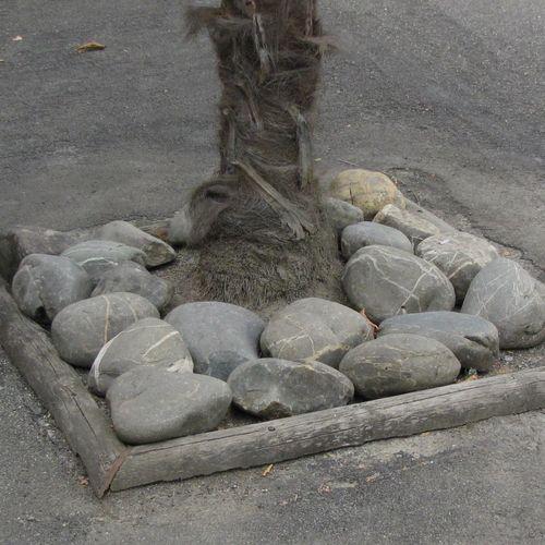 Vous pouvez maintenant positionner les galets. Posez-les la face la plus plate sur le sol. Agencez vos galets de sorte qu’il n’est pas d’espace entre eux. Certains galets ont une face cassée, dissimulez-la avec un autre galet.