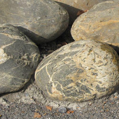 Pour servir de bordure de voirie, les galets sont posés sur un lit de béton humide.