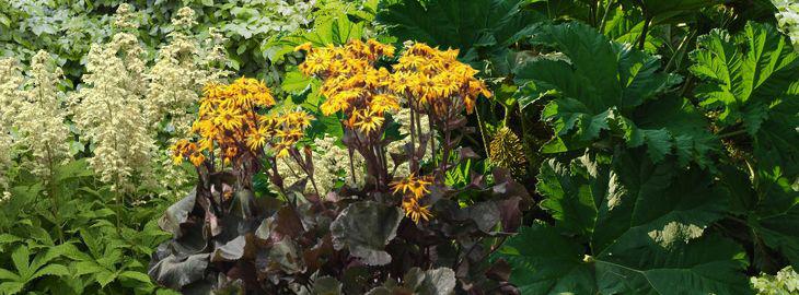 Rodgersia « Borodin » fleurs blanches en exemple sur la photo du haut. Il en existe de nombreuses variétés