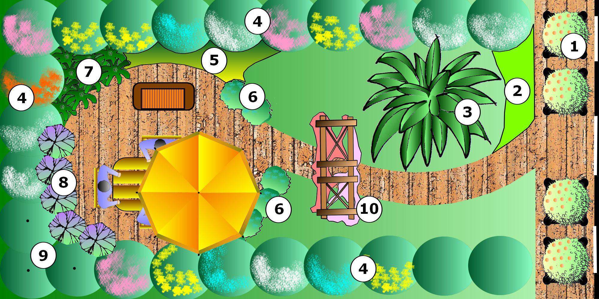 Sur ce plan de jardin parfumé, une terrasse circulaire est blottie dans les arbustes formant la haie (4).