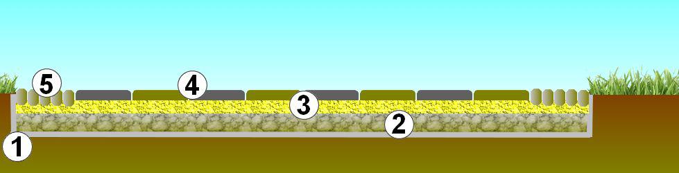 Sur l’exemple proposé, chaque dalle teintée dans la masse représente une case du jeu. Les dalles font 30/30 cm. vous en trouvez chez tout bon marchand de matériaux.(-4-)