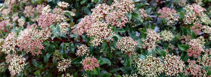 Viburnum tinus bewleys variegated : 1 m, feuillage marginé de crème, fleurs roses en boutons à peine éclos, puis blanches.