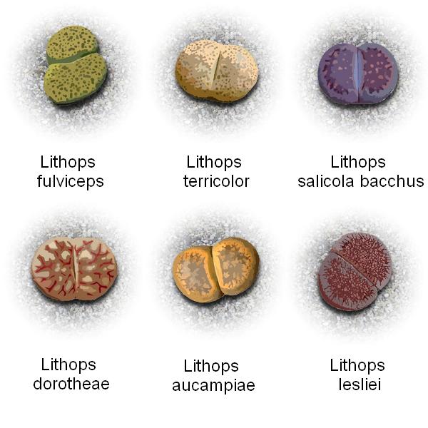 Les nombreuses espèces et variétés des originales « plantes-cailloux » ou lithops, véritables curiosités, sont peu exigeantes en eau, mais leur culture demande des soins appropriés très attentifs.