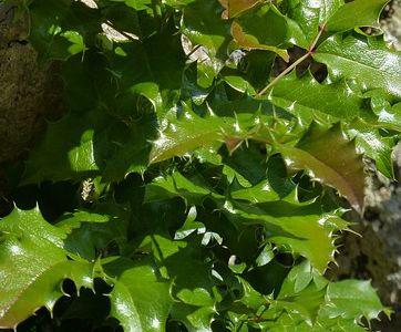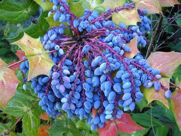 portent dix-neuf à trente-sept folioles minces et rigides, à bords dentés et pourvus d’épines, de couleur vert brillant. Les fleurs, épanouies en novembre-décembre, groupées en faisceaux de grappes, donnent naissance à des fruits ovoïdes bleus. Cette espèce très gracieuse, rustique au froid, peut être installé en sous-bois.