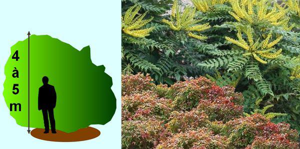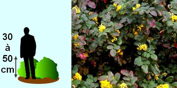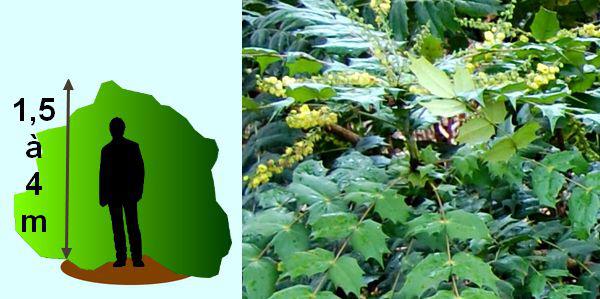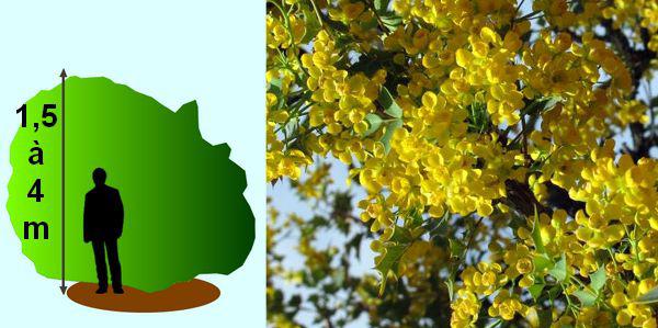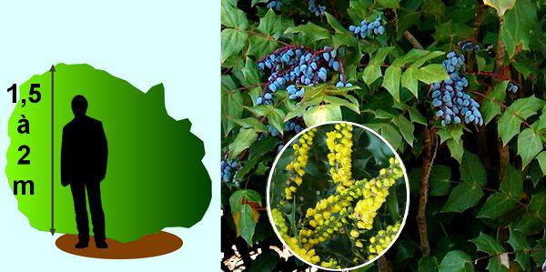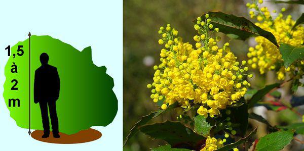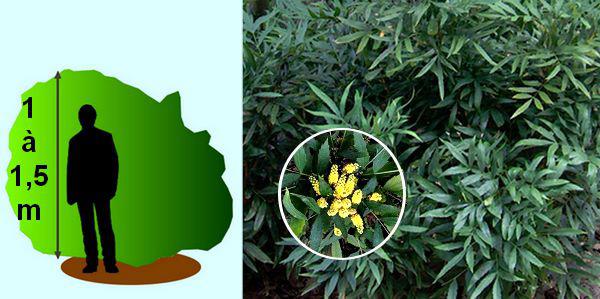 Les longues feuilles disposées en rosette composées de folioles épineuses, vert foncé, brillantes. Les tiges sont érigées. Les longues grappes de petites fleurs jaune vif au parfum de muguet apparaissent parfois dès le mois de decembre. les fleurs dressées s'étalent au moment de la fructification de baies bleu foncé. Le feuillage qui se teinte de rouge en hiver est splendide.
