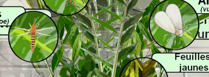 Ces petits insectes suceurs blancs se regroupent au revers des feuilles et favorissent eux aussi la fumagine. |