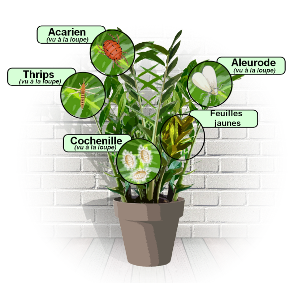 | Les parasites qui suivent infesteront plus rarement votre zamioculcas zamiifolia, mais si vous avez à proximité d'autres plantes vertes hôtes de ces parasites, ils pourront alors l'infester. |